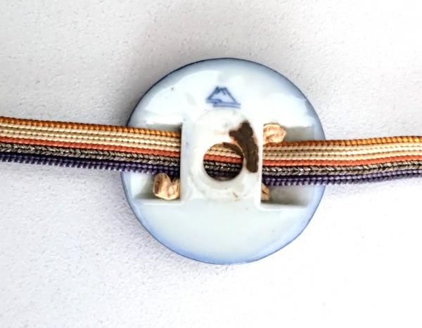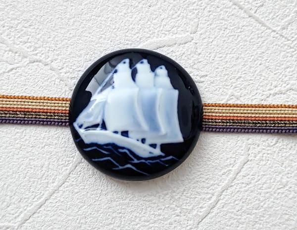 深いジャパンブルーの中に白い帆船と波のコントラストが美しい深川製磁の帯留めになります。