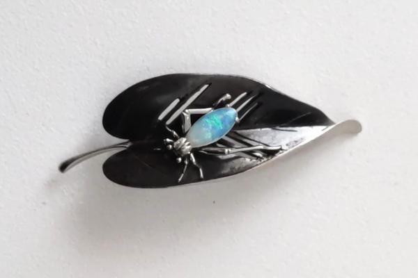 アンティーク帯留め・彫金の葉にオパールの昆虫 |