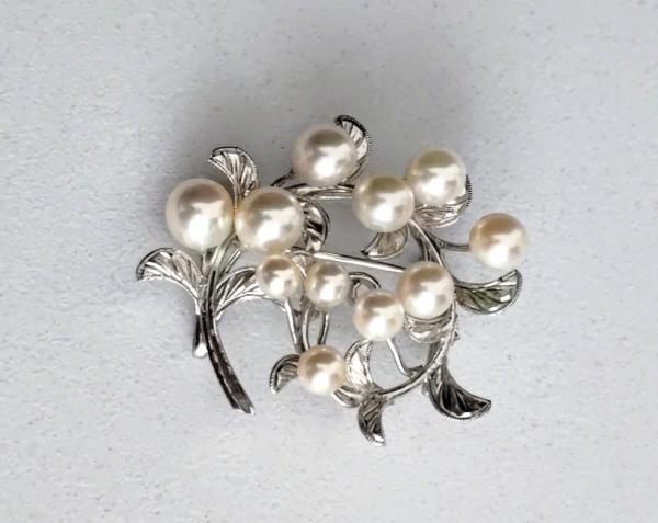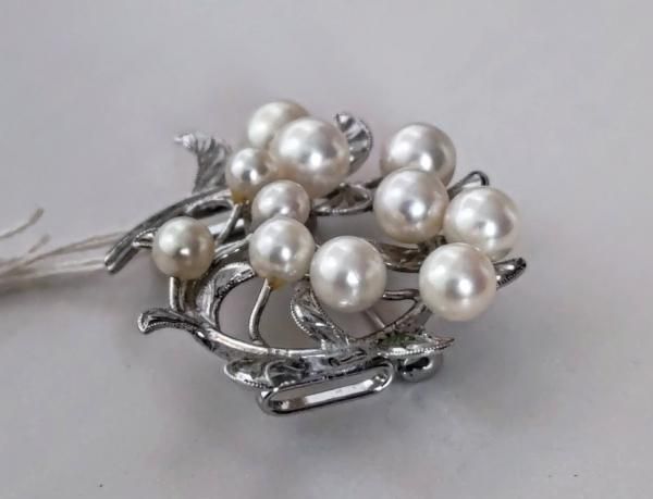 くるりと巻いたフォルムのベースに大小11粒のパールの花をあしらったエレガントな帯留めで、ブローチと兼用になっています。