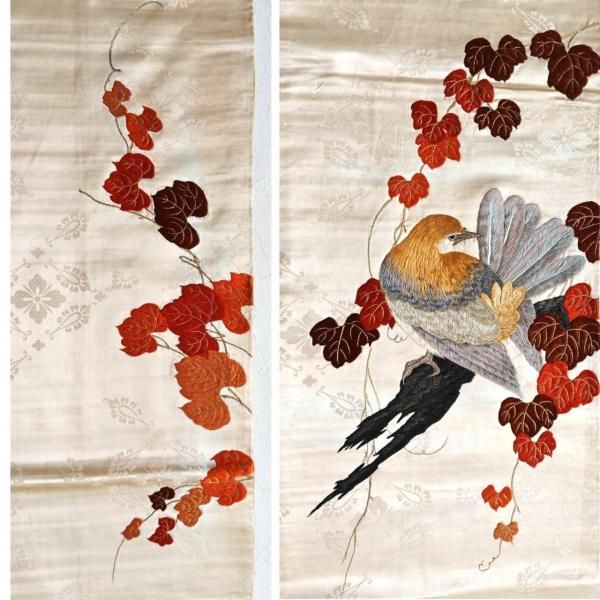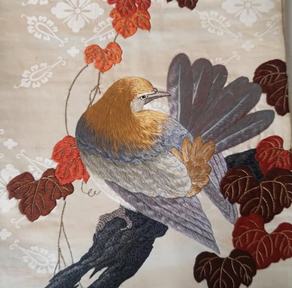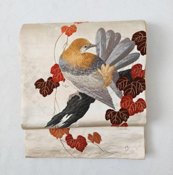 | | アンティーク・ペールピーチ暈し地蔦と山鳩刺繍袋帯 |