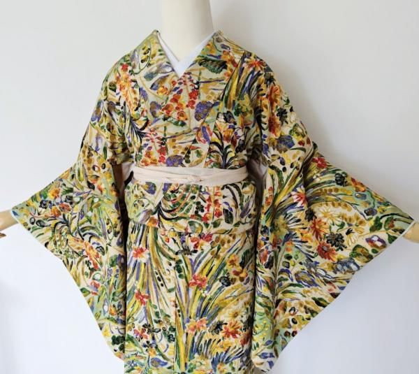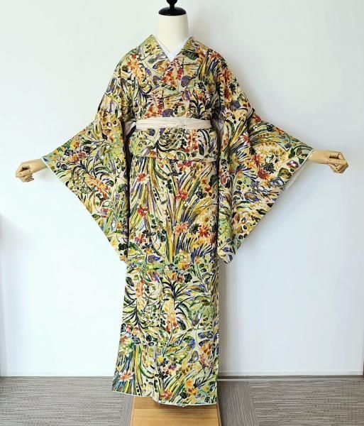 | | アンティーク・クリーム染め分け地に油彩タッチの花々小紋 |