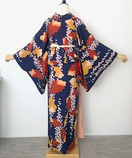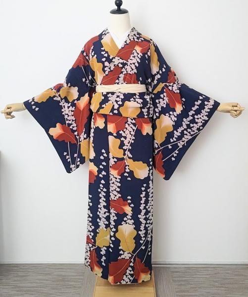余白を生かしたネイビー地の秋柄の小紋で、赤茶とマスタード色の大きな柏葉をライトグレーと白の軽やかな色の小さな蔦が可愛らしく装飾するようなデザインです。