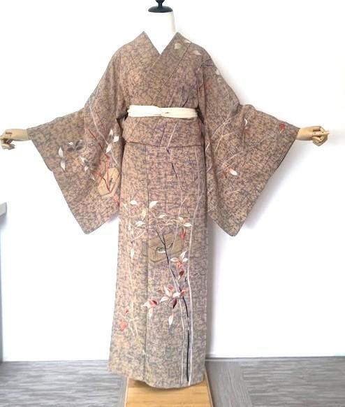 | | アンティーク・ベージュ×グレー地に木立と鳥かご訪問着 |