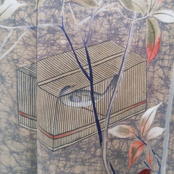 網目のようにグレーの模様が染められたベージュ地に、手描きの木に掛けられた鳥かご柄の訪問着です。